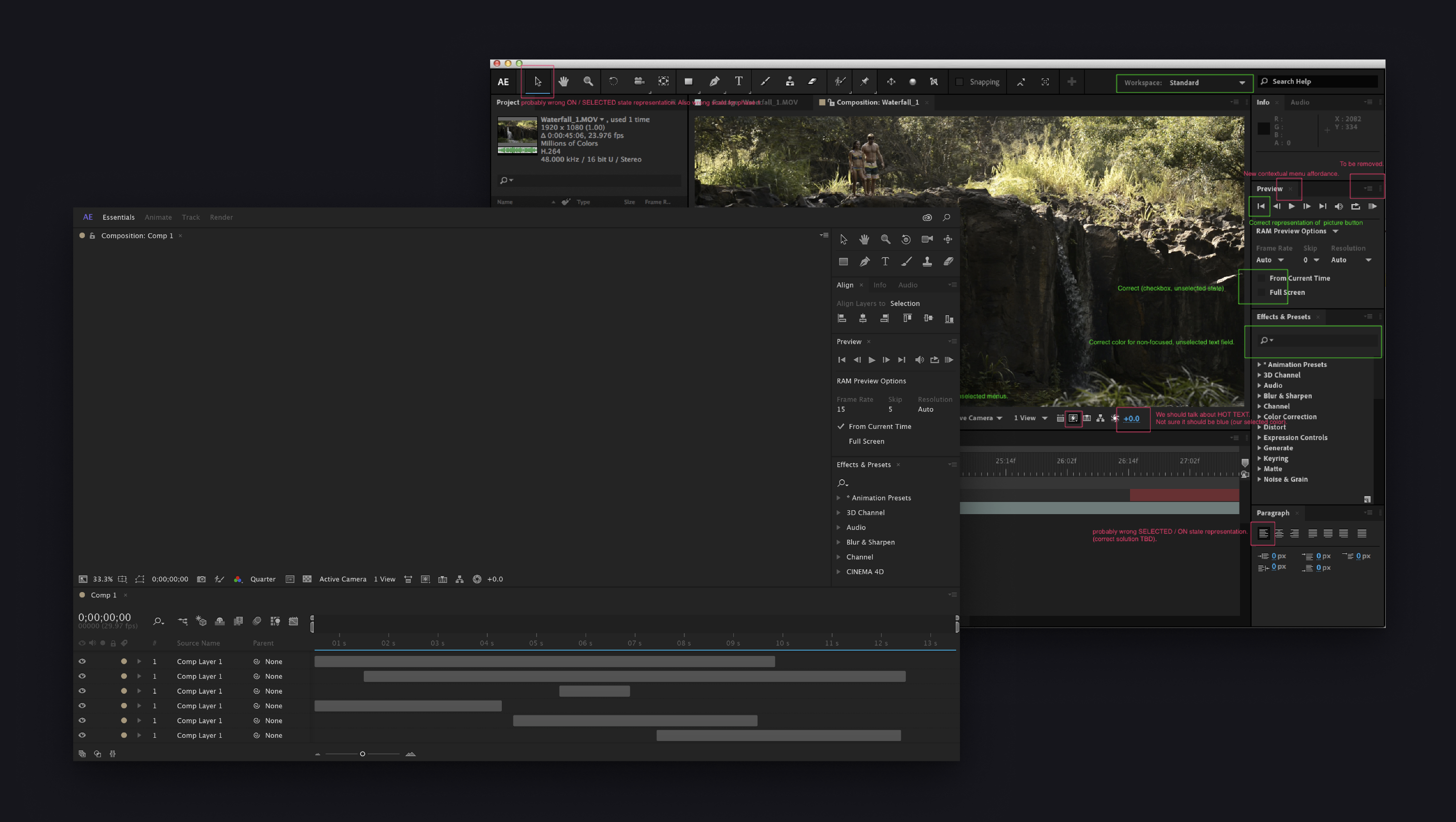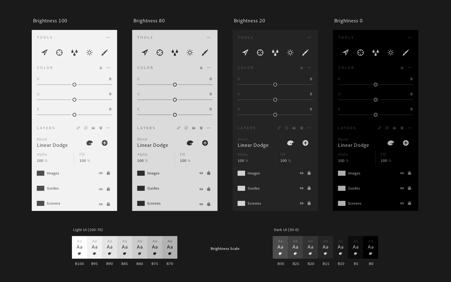 Working on Spectrum taught me that every pixel really matters, especially in dense workspaces. Where earlier versions of Adobe software had needless bevels, inner shadows and other decoration, Spectrum UI was simple and streamlined. We also ruthlessly stripped back the various colors and type styles and made everything a lot more accessible and easier to parse.
