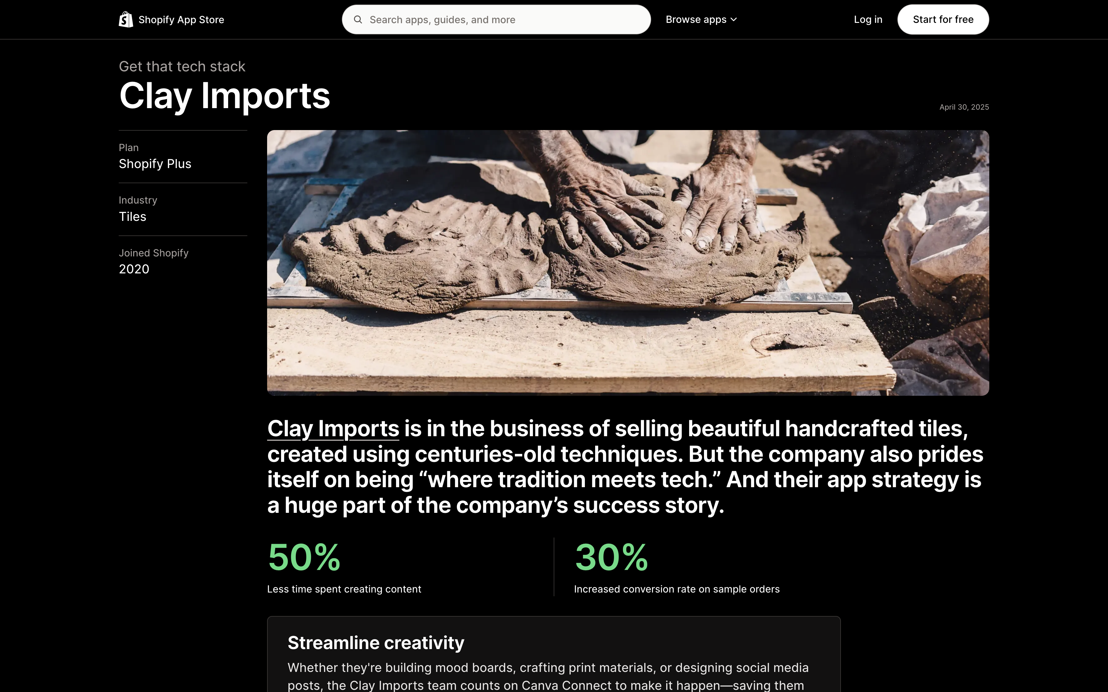 Shopify's app store is not just a place to find and install apps – it's also a place for merchants to learn. Our editorial design includes features that peel back the cover of how successful merchants have set up their store, with app recommendations and testimonials to guide merchants' decisions when deciding which apps might be right for them. The design approach to these features is bold type and beautiful imagery, combined with meaningful store data and technical informaton to keep the story grounded.
